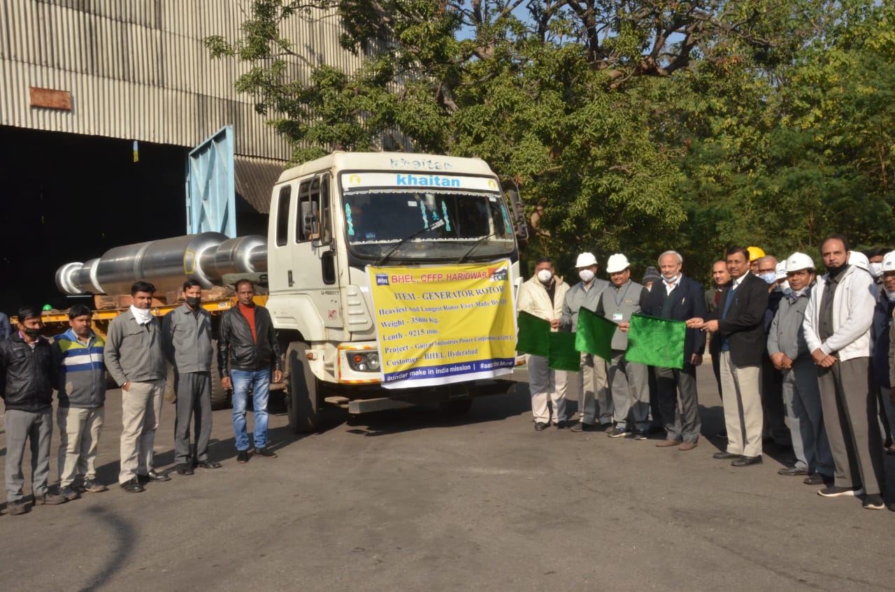 बीएचईएल हरिद्वार के कार्यपालक निदेशक पी. सी. झा ने हरी झंडी दिखाकर इसे रवाना किया । इस रोटर फोर्जिंग का निर्माण एवं आपूर्ति गुजरात इंडस्ट्रियल पावर कारपोरेशन लिमिटेड से प्राप्त प्रतिष्ठित आर्डर के संदर्भ में बीएचईएल हैदराबाद को की गई है ।