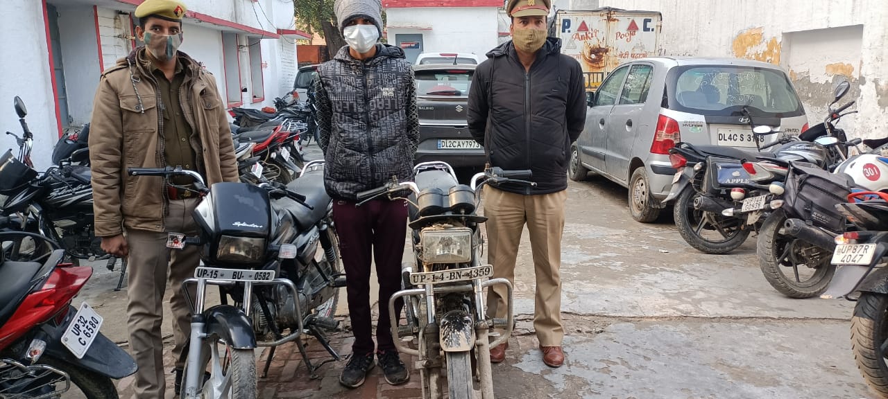 जिला गाजियाबाद के थाना मोदीनगर क्षेत्र के अंतर्गत वरिष्ठ पुलिस अधीक्षक पवन कुमार के कुशल निर्देशन में चलाए गए वांछित अभियुक्तों के विरुद्ध अभियान के क्रम में पुलिस अधीक्षक ग्रामीण ईराज राजा के निर्देशन में एवं क्षेत्राधिकारी मोदीनगर सुनील कुमार के सफल पर्यवेक्षण में प्रभारी निरीक्षक के नेतृत्व में उपनिरीक्षक अनिल कुमार की टीम द्वारा मुखबिर की सूचना पर तिबड़ा बम्वा पुलिया चेकिंग के दौरान पुत्र चंद्रहास निवासी गली नंबर 6 इंद्रपुरी थाना मोदीनगर गाजियाबाद उम्र 19 वर्ष को चोरी की दो मोटरसाइकिल सहित गिरफ्तार किया गया जिसके संबंध में थाना हाजा पर मुकदमा अपराध संख्या 010/22 धारा 411भादवी पंजीकृत किया गया।