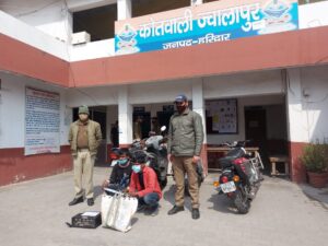 ज्वालापुर क्षेत्र अंतर्गत रवि गोस्वामी पुत्र राजवीर गोस्वामी निवासी शिव मंदिर दक्ष एंक्लेव हरि लोक कोतवाली ज्वालापुर हरिद्वार द्वारा लिखित सूचना दी कि अज्ञात चोर उनके बंद मकान व मकान के पास स्थित मंदिर का ताला तोड़कर घर का सामान व धनराशि चोरी कर ले गए जिसके आधार पर थाना हाजा पर मुकदमा पंजीकृत किया गया। घटना के तत्काल अनावरण करने हेतु पुलिस उपमहानिरीक्षक / वरिष्ठ पुलिस अधीक्षक द्वारा निर्देशित किया गया जिस के क्रम में पुलिस अधीक्षक नगर व सहायक पुलिस अधीक्षक/ क्षेत्राधिकारी ज्वालापुर के निर्देशन में प्रभारी निरीक्षक ज्वालापुर को तत्काल घटना के अनावरण करने हेतु निर्देशित किया गया जिस पर प्रभारी निरीक्षक ज्वालापुर द्वारा तत्काल उपनिरीक्षक शेख सद्दाम हुसैन के नेतृत्व में एक टीम का गठन किया गया टीम द्वारा तत्काल चोरी का संज्ञान लेते हुए संदिग्ध व्यक्तियों की चेकिंग के दौरान मुखबिर की सूचना पर रेगुलेटर पुल से दो अभियुक्तों को चोरी किए गए माल के साथ गिरफ्तार किया गया तथा बरामदगी के आधार पर धारा 411/ 34 आईपीसी की बढ़ोतरी की गई।