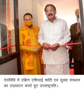 माननीय उपराष्ट्रपति एवं माननीय राज्यपाल अपने एक दिवसीय प्रवास पर शनिवार को देवसंस्कृति विवि पहुंचे। यहां उन्होंने दक्षिण एशियाई शांति एवं सुलह संस्थान (दएशांसुसं) का उद्घाटन किया। यह संस्थान दक्षिण एशियाई देशों के बीच तमाम राजनीतिक चुनौतियों के मद्देनजर क्षेत्रीय स्थिरता और आपसी सकारात्मक व्यवहार की स्थापना को प्रेरित करता रहेगा। विवि में इस संस्थान की स्थापना को उपराष्ट्रपति ने इस क्षेत्र का मील का पत्थर जैसा बताया।