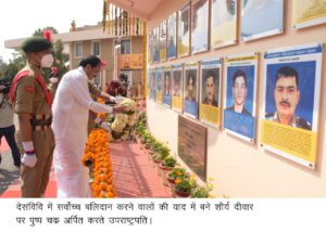 देश के माननीय उपराष्ट्रपति एम वेंकैया नायडू ने देव संस्कृति विश्वविद्यालय परिसर में दक्षिण एशियाई शांति एवं सुलह संस्थान (दएशांसुसं) का शुभारंभ किया। साथ ही उन्होंने विवि में स्थापित एशिया के प्रथम बाल्टिक सेंटर का निरीक्षण किया तथा देश के लिए अपना सर्वोच्च बलिदान देने वाले वीर शहीदों के याद में बने शौर्य दीवार पर पुष्पांजलि अर्पित की। इससे पूर्व उपराष्ट्रपति एवं माननीय राज्यपाल ले.ज. (सेनि) गुरमीत सिंह का विवि पहुंचने पर कुलपति शरद पारधी, प्रतिकुलपति डॉ चिन्मय पण्ड्या ने पुष्प गुच्छ भेंटकर भव्य स्वागत किया।