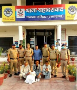 थाना बहादराबाद की पुलिस टीम द्वारा गौकशी टीम को मुखबिर के द्वारा सूचना दी गई कि ग्राम मुस्तफाबाद मे गांव के नजदीक ही इरसाद के खेत मे कुछ व्यक्तियों द्वारा गोकशी की जा रही हैं। इस सूचना पर नजदीकी पुलिस चौकी संतरशाह से उ0नि0 अकरम अहमद को मय का0 दिनेश व का0 अंकित को साथ लेकर सयुक्त टीम बनाकर ग्राम मुस्तफाबाद में मुखबिर के बताए अनुसार दबिश दी गई ।तो मौके से तीन अभियुक्त 1 इकराम पुत्र अब्बास। 2 सकील पुत्र दीन मोहम्मद। 3 सलीम पुत्र मंगता निवासीगण ग्राम मुस्तफाबाद, थाना बहादराबाद, हरिद्वार को गिरफ्तार किया गया।
