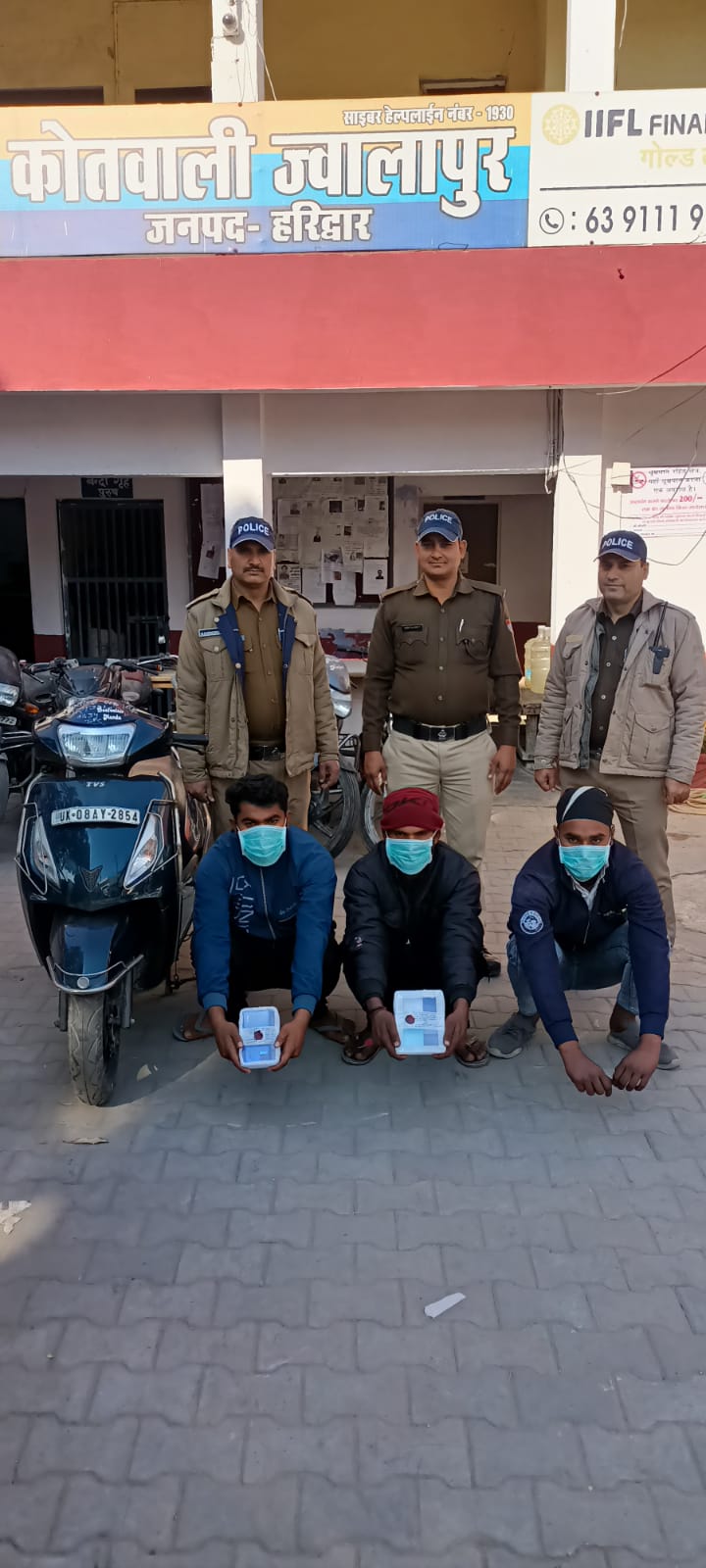क्षेत्र में मोबाइल/स्नैचिंग की घटनाओं को देखते हुए घटना के तत्काल अनावरण करने हेतु श्रीमान वरिष्ठ पुलिस अधीक्षक महोदय द्वारा निर्देशित किया गया जिस के क्रम में श्रीमान पुलिस अधीक्षक नगर व क्षेत्राधिकारी ज्वालापुर के निर्देशन में प्रभारी निरीक्षक ज्वालापुर को तत्काल घटना के अनावरण करने हेतु निर्देशित किया गया। जिस पर प्रभारी निरीक्षक ज्वालापुर आर के सकलानी द्वारा उप निरीक्षक सुनील रमोला के नेतृत्व में घटना का खुलाशा करने के लिए टीम का गठन किया गया गठित टीम द्वारा क्षेत्र के सीसीटीवी कैमरे की फुटेज चेक करते हुए मुखबिर की सूचना पर तीन अभियुक्तो गुरप्रीत, आकाश,व सागर निवासी गण बादशाहपुर थाना पथरी हरिद्वार को छीने गए मोबाइल ओप्पो तथा घटना में प्रयुक्त स्कूटी टीवीएस जूपिटर नंबर UK08AY 2854 के साथ गिरफ्तार किया गया। अभियोग में धारा 411- 34 आईपीसी की बढ़ोतरी की गई अभियुक्त गणो को माननीय न्यायालय मे पेश किया जा रहा है।