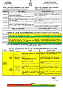 भारत मौसम विज्ञान केंद्र द्वारा जारी 3 घंटे के तत्कालिक मौसम पूर्वानुमान के मुताबिक राज्य के उधम सिंह नगर ,पौड़ी , रुद्रप्रयाग, नैनीताल ,अल्मोड़ा ,चमोली ,चंपावत जनपदों में कहीं-कहीं तीव्र बौछार ओलावृष्टि और झक्कड़ 60 से 70 किलोमीटर प्रति घंटे की रफ्तार से चलने की संभावना है जिसको लेकर ऑरेंज अलर्ट जारी किया गया है इसके अलावा राज्य के जनपदों के कुछ स्थानों में हल्की से मध्यम वर्षा गरज चमक के साथ होने की संभावना है। इस दौरान मौसम विज्ञान केंद्र ने एतिहाद बरतने की सलाह दी है।