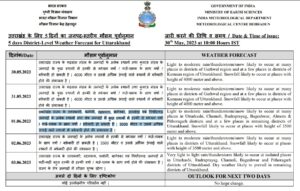 मौसम विभाग की ओर से जारी पूर्वानुमान के मुताबिक 30 मई को कुछ स्थानों में हल्की से मध्यम बारिश, गरज-चमक के साथ और 30 मई को राज्य के पर्वतीय जनपदों के कुछ स्थानों में और राज्य के मैदानी जनपदों में कहीं-कहीं बहुत हल्की से हल्की बारिश गरज-चमक के साथ होने के आसार हैं। 31 मई को उत्तरकाशी, चमोली, पिथोरागढ़, बागेश्वर और रुद्रप्रयाग जनपदों के ऊंचाई वाले क्षेत्रों में कहीं-कहीं बहुत हल्की से हल्की वर्षा ,गरज-चमक के साथ वर्षा होने की संभावना है। राज्य के शेष जनपदों में मौसम शुष्क रहेगा।