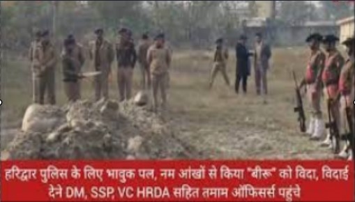 17.5 वर्ष पुलिस विभाग में निरंतर सेवा देने वाले बीरू को राजकीय सम्मान के साथ दी गई विदाई। कनखल बैरागी कैंप में आयोजित बीरू की अन्तिम यात्रा में जिलाधिकारी हरिद्वार धीराज सिंह गर्ब्याल, एस.एस.पी. प्रमेन्द्र डोबाल व वीसी एचआरडीए अंशुल कुमार एवं अन्य पुलिस ऑफिसर्स भी सम्मिलित हुए ।