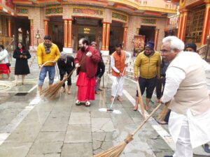 नगर विधायक मदन कौशिक, एवं महामंडलेश्वर डॉ संतोषानंद देव महाराज के साथ कार्यकर्ताओं ने पूरे मंदिर परिसर में झाड़ू लगाकर धुलाई की।