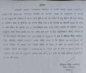 आबकारी आयुक्त के आदेश के अनुपालन मे जिलाधिकारी हरिद्वार धीराज सिंह गबर्याल ने कहा “मै आदेश पारित करता हू दिनांक 22/01/2024 को जनपद हरिद्वार की की सभी देशी विदेशी मदिरा और बीयर के थोक एवं फुटकर बिक्री की दुकानें, बार एवं डिपार्टमेंटल स्टोर आदि मदिरा उपभोग से संबंधित समस्त अनुज्ञापन कार्य दिवस अवधि तक बन्द रहेंगे। इस बन्दी के लिए लाइसेंसधारी किसी प्रतिकर या दावे का हकदार नहीं होगा। कृपया तदनुसार अनुपालन कराना सुनिश्चित करें”।