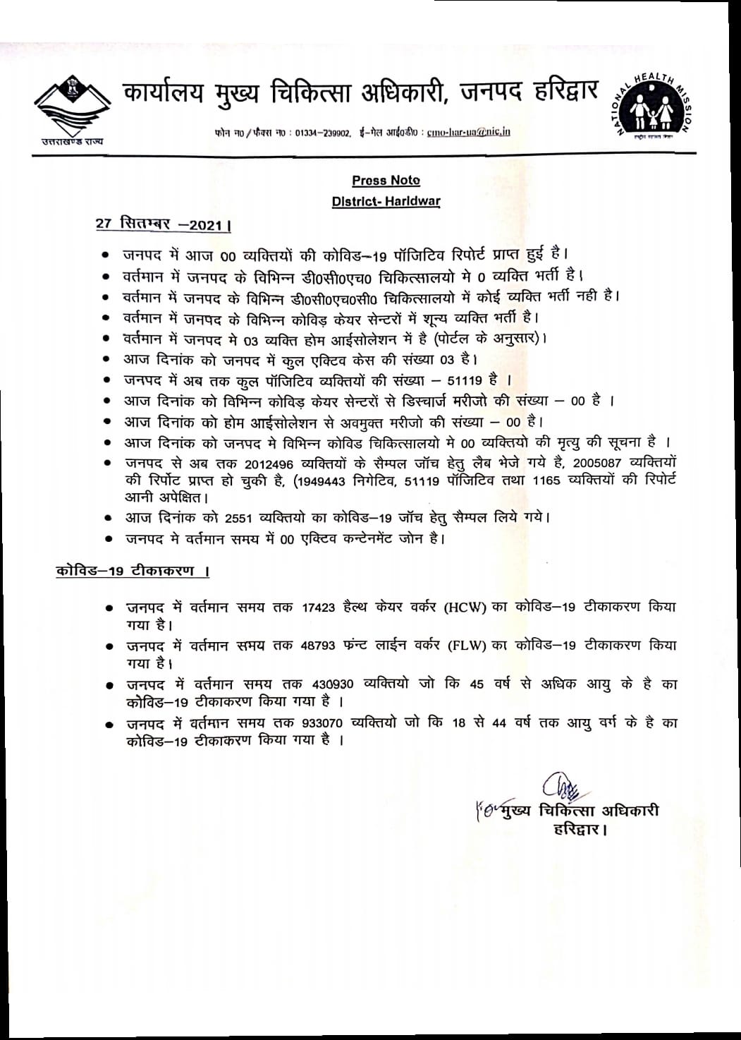 कार्यालय मुख्य चिकित्सा अधिकारी जनपद हरिद्वार द्वारा पूरे दिन की करो ना अपडेट का प्रेस नोट जारी किया गया है।